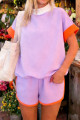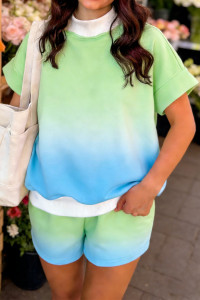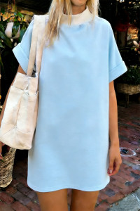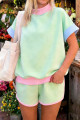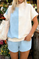 Mistblauwe effen kleur, oversized T-shirt met zichtbare naden en opstaande kraag, casual shorts, 2-delige set