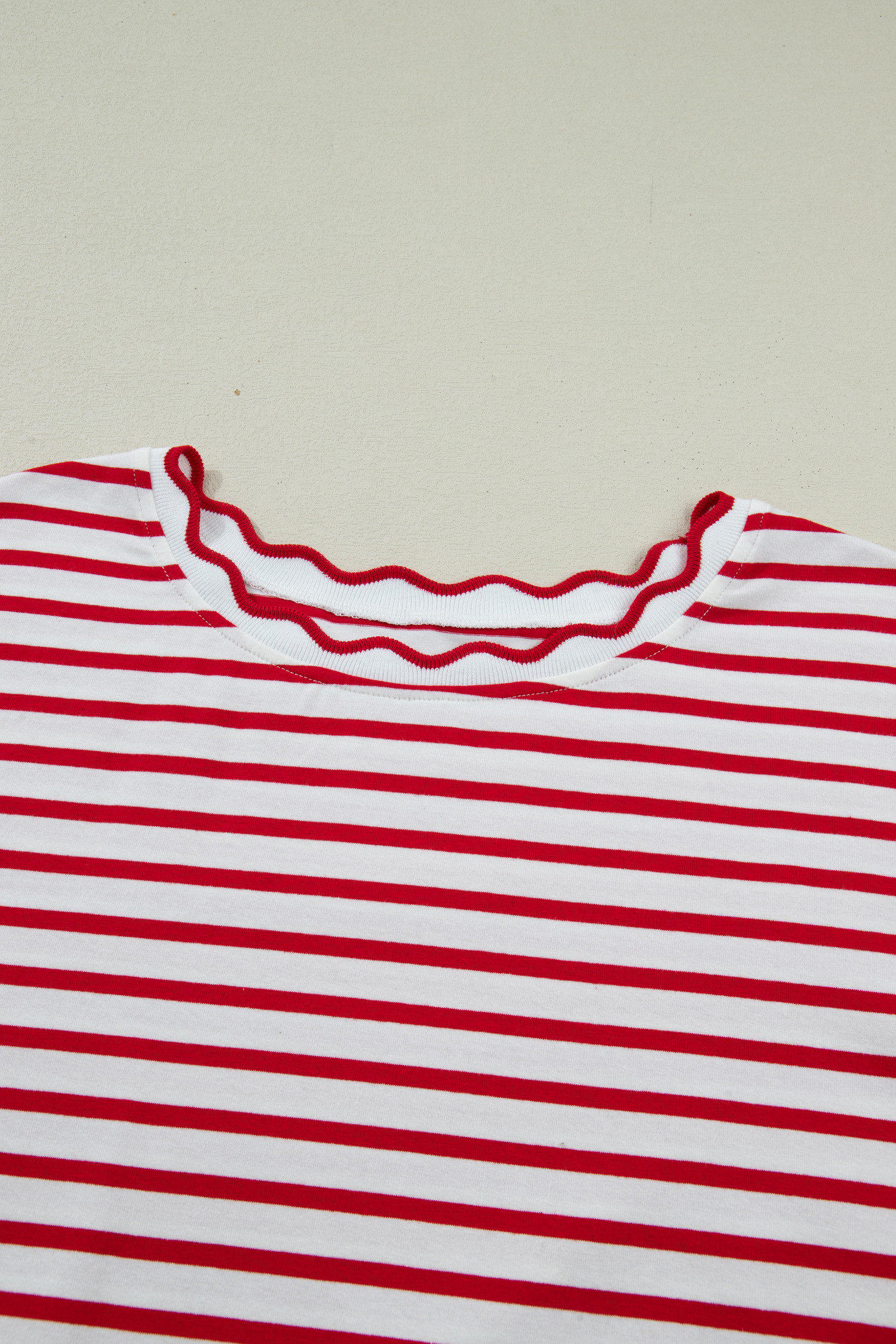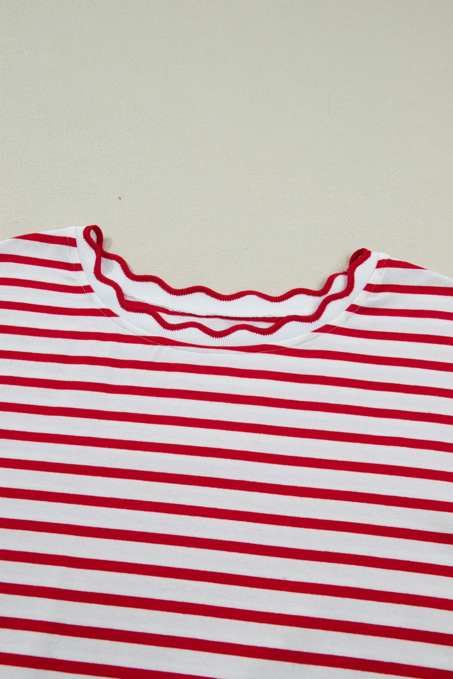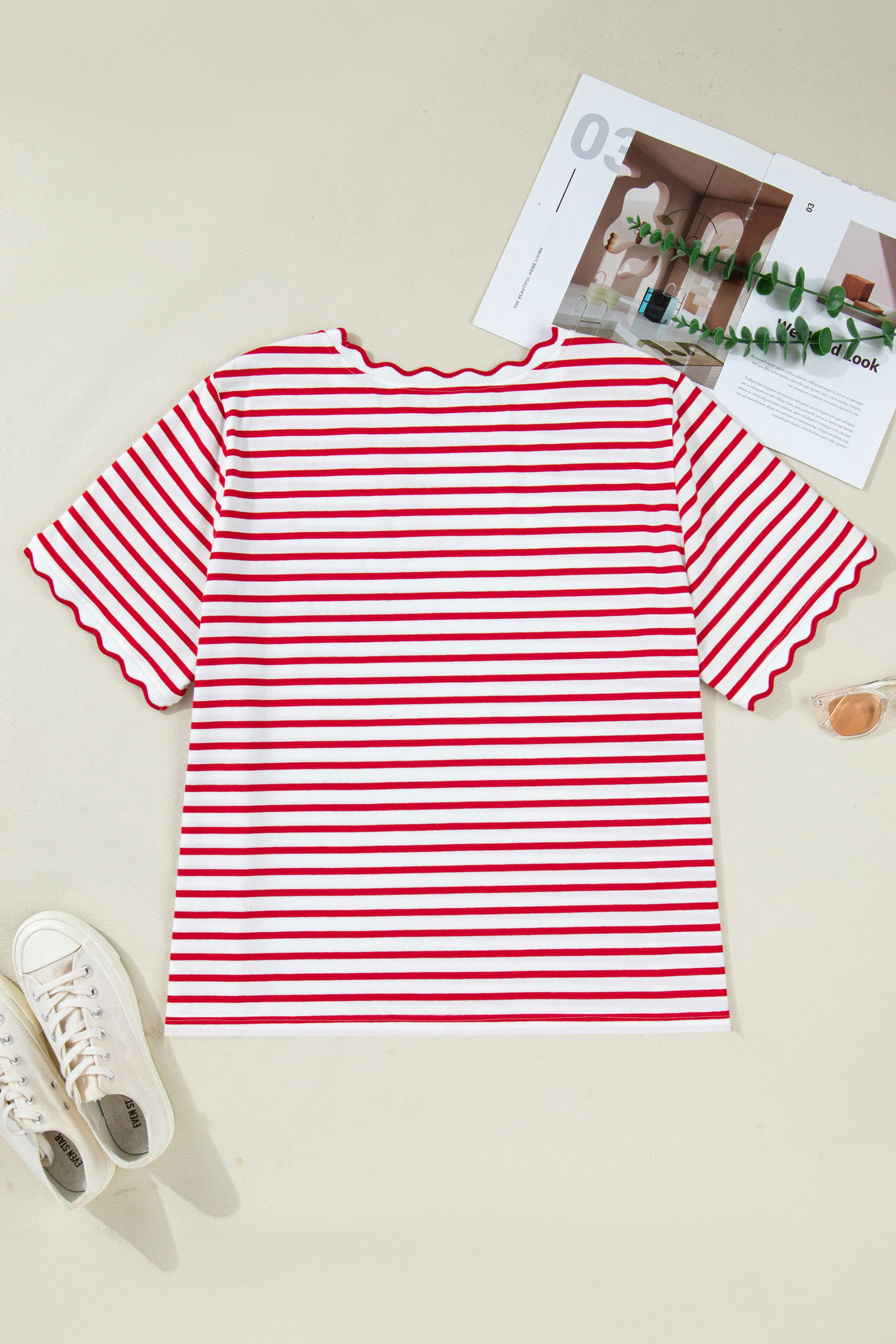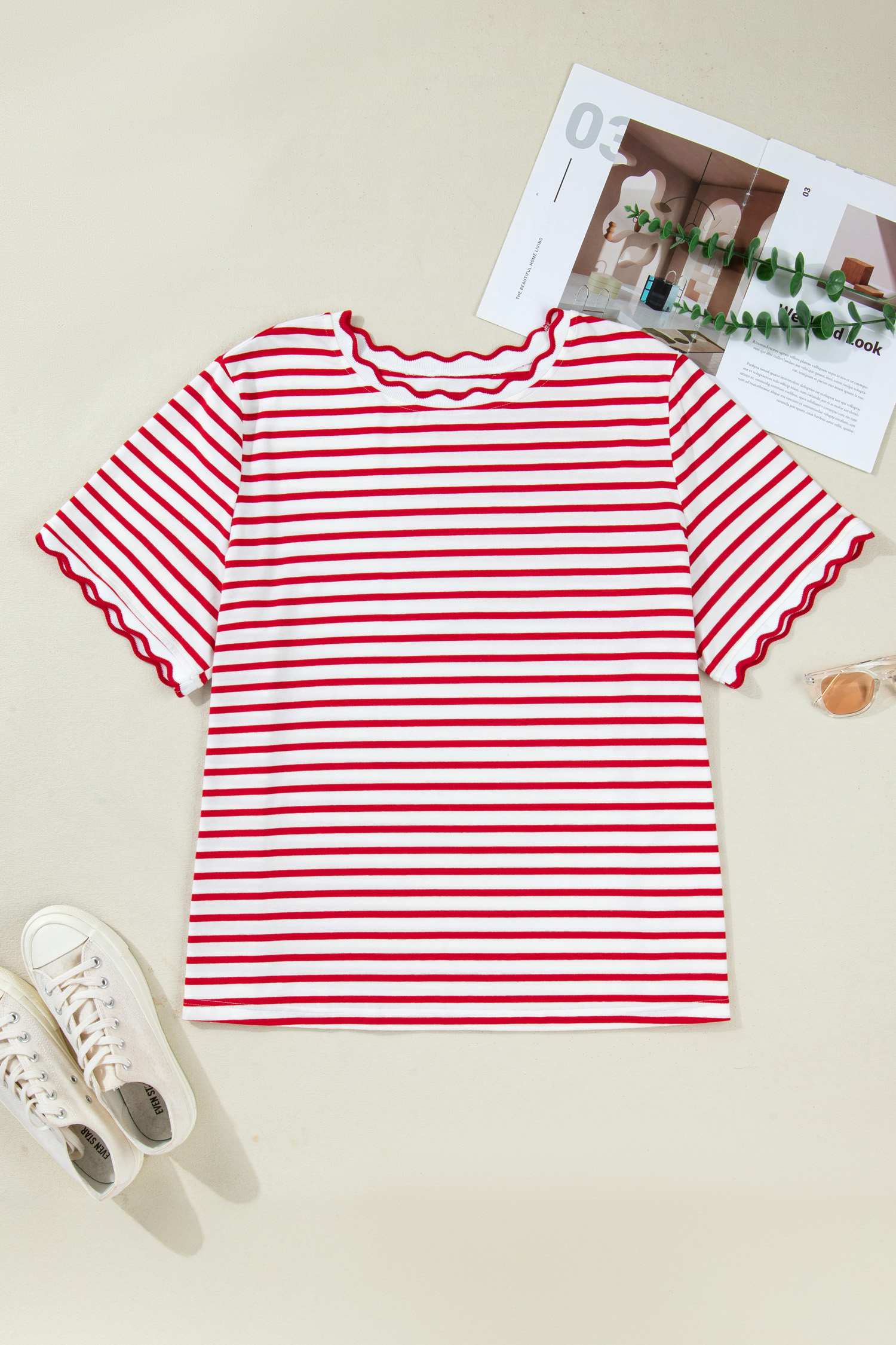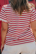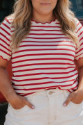 Rode gestreepte top met ronde hals en geschulpte rand, korte mouwen, plus size