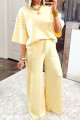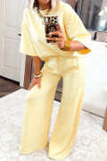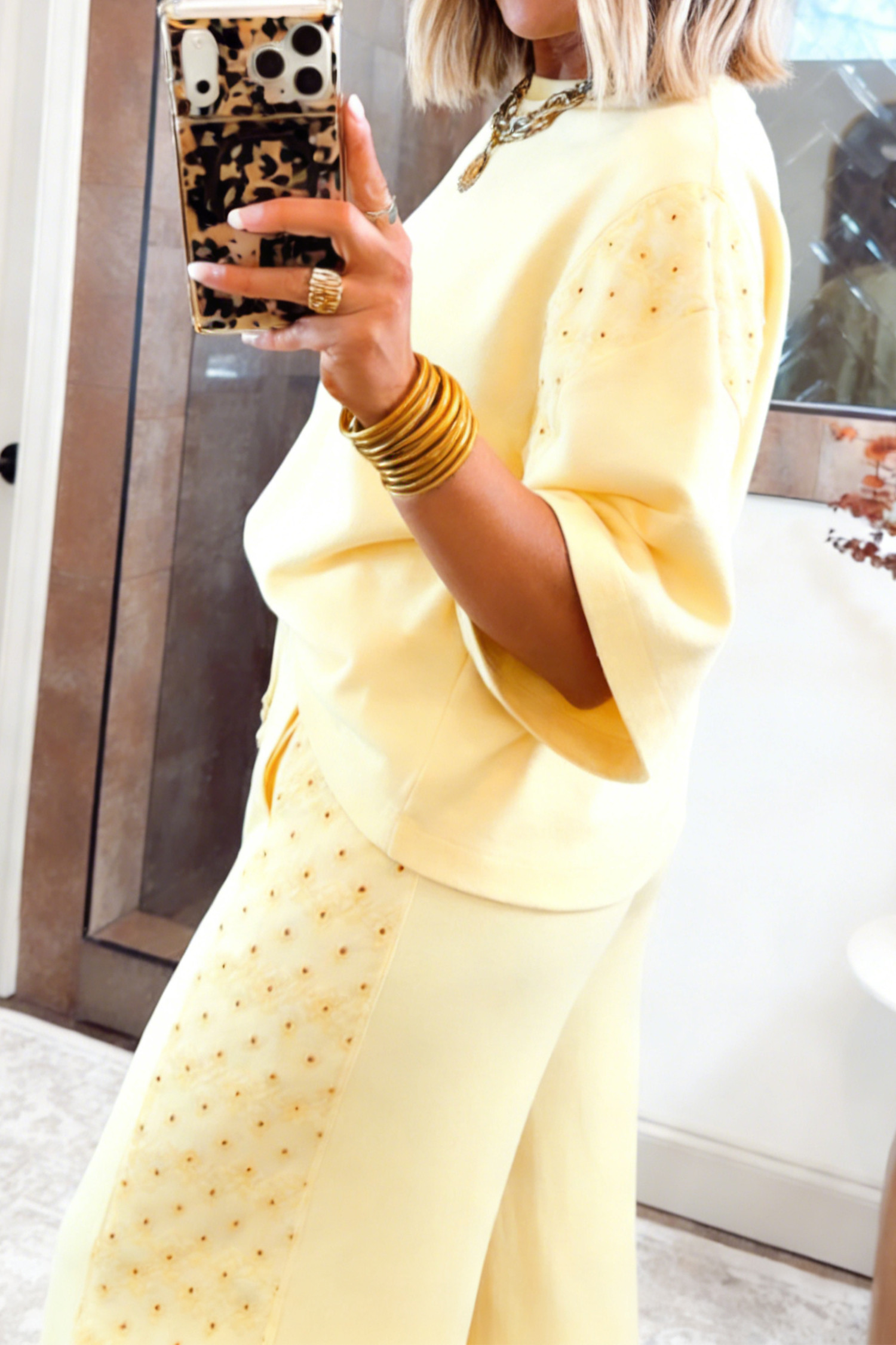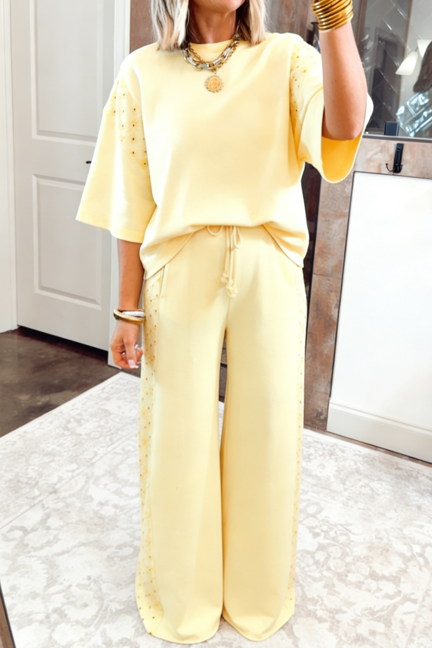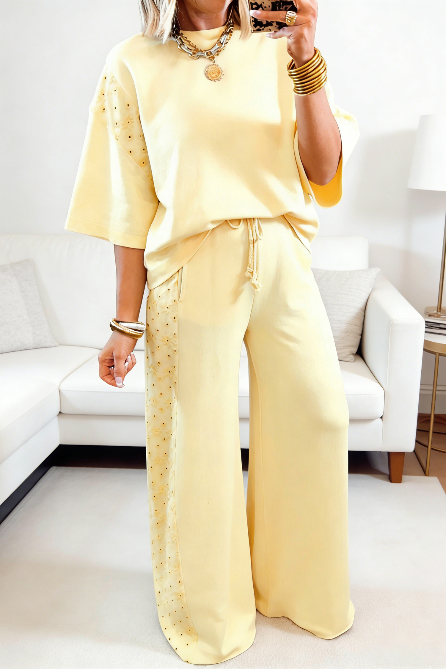 Geel crèmekleurig effen T-shirt met oogjeskant en patchwork, oversized model, losse broek met trekkoord, 2-delige set
